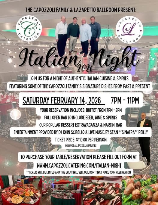 Feb 14 – SAT, Lazaretto Ballroom – “ITALIAN NIGHT” like an Italian Wedding but with no Bride or Groom – 99 Wanamaker Ave, Essington, PA 19029, 484-494-5060 http://lazarettoballroom.com/